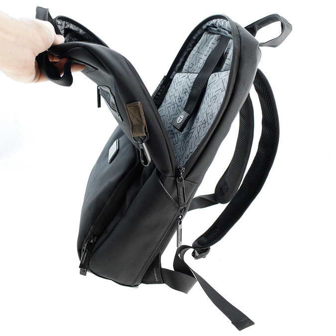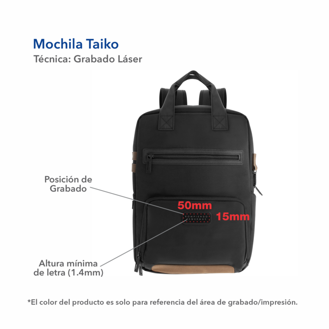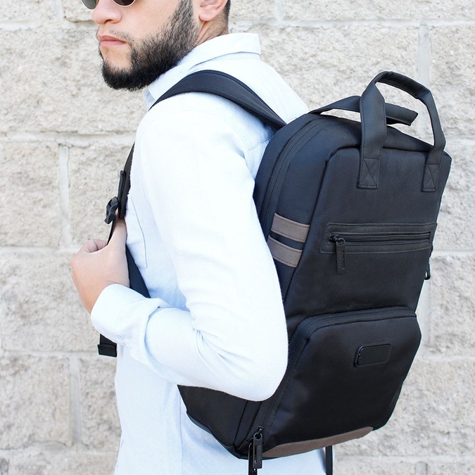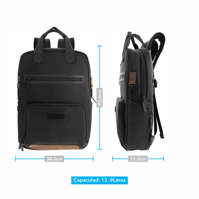Mochila marca TAKAYAMA, fabricada en poliéster de alta resistencia. Detalles en piel color café. Materiales que repelen el agua. 2 Bolsas frontales. La superior cuenta con forro interior con sistema de protección RFID; la inferior está habilitada con doble tira cierres y forro en laterales para evitar caía de objetos. Compartimento principal con espacio para laptop de 15.6” con full padding que brindará máxima protección al equipo. La cara opuesta en el interior cuenta con multi organizadores para accesorios y un par de ganchos tipo mosquetón. Bolsa lateral expandible para colocar una botella de agua. Cuenta con apertura en la espalda que permite pasar el bastón de la maleta de manera estable. Placa metálica frontal para grabado láser. Capacidad: 13.9 Litros. Incluye bolsa cubre polvo.