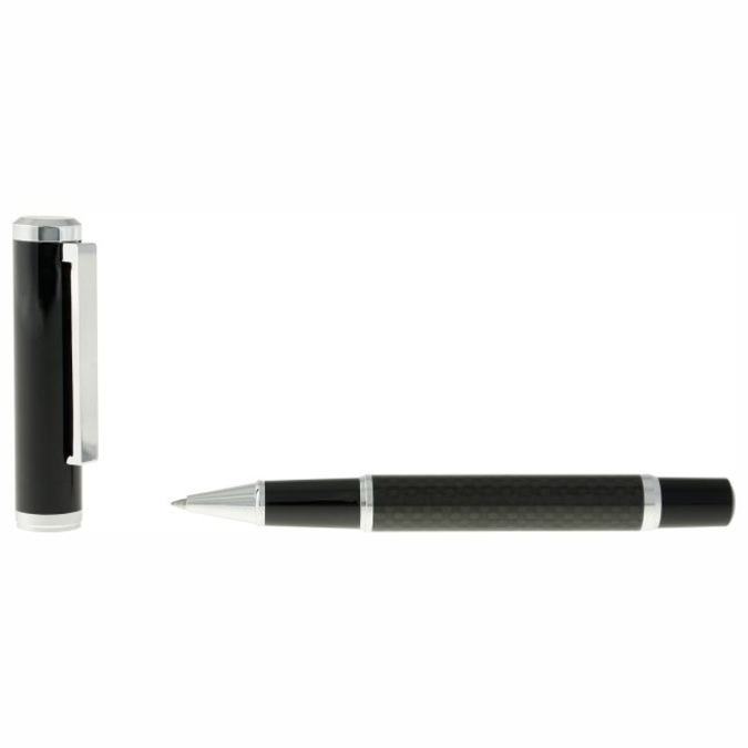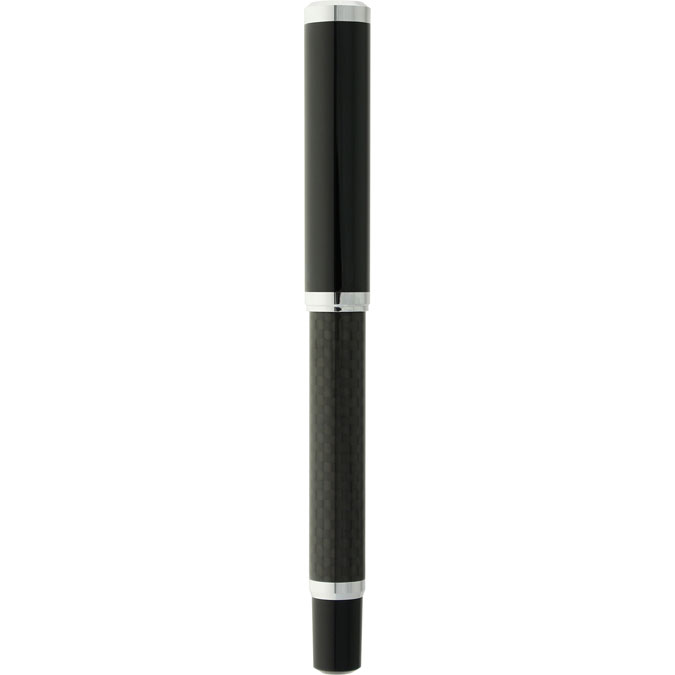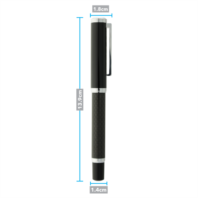 Suntory Millenium Bolígrafo metálico con tapón que cierra a presión. Acabado negro brillante. Detalles color cromo y cuerpo de fibra de carbono que le da ese singular diseño cuadriculado. Igual que el bolígrafo suntory, pero con tapón más robusto. Escritura de alto desempeño debido a su repuesto japonés tipo roller (a elegir entre tinta negra o azul). Incluye estuche individual.
