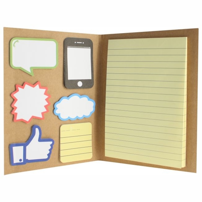 Set Recaditos 2 Notas Adhesivas con formas varias y divertidas contenidas en un folder de cartón reciclado que simula una libreta.