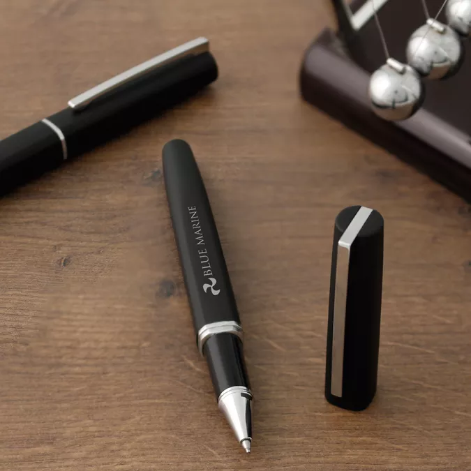 Square Bolígrafo metálico de cuerpo cuadrangular con tapón que cierra a presión. Detalles color cromo. Suave textura ahulada. Escritura de alto desempeño debido a su repuesto japonés tipo roller (a elegir entre tinta negra o azul). Incluye estuche individual.