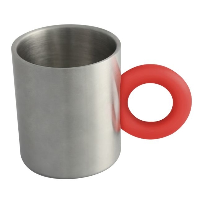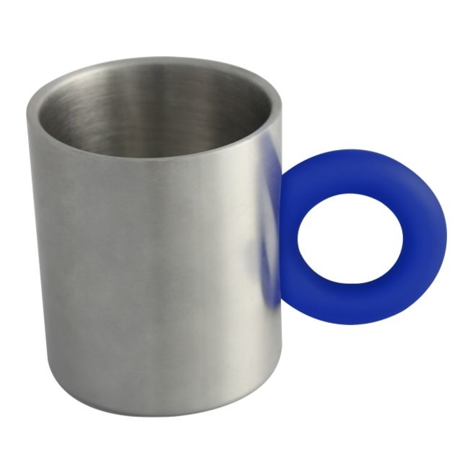 Taza Dona Divertida taza de acero inoxidable 300 ml con un inserto de plástico rígido en forma de dona que funciona como asa. A elegir entre varios colores. Se entrega en cajita de cartón individual. Lavar antes de usar.