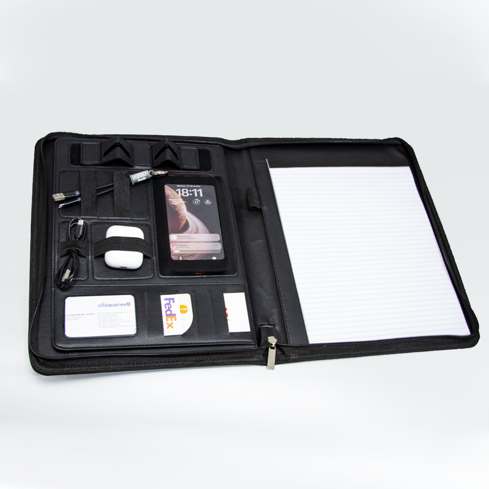 QANA Carpeta con cubierta exterior de poliéster 300D e interior de PU. Placa metálica para grabado y cierre. Compartimentos para tarjetas, sujetador de bolígrafo bolígrafo, porta celular. Cintas elásticas para sujetar diversos artículos y soporte con velcro para tablet o celular. Bloc A4 con 20 hojas rayadas.
