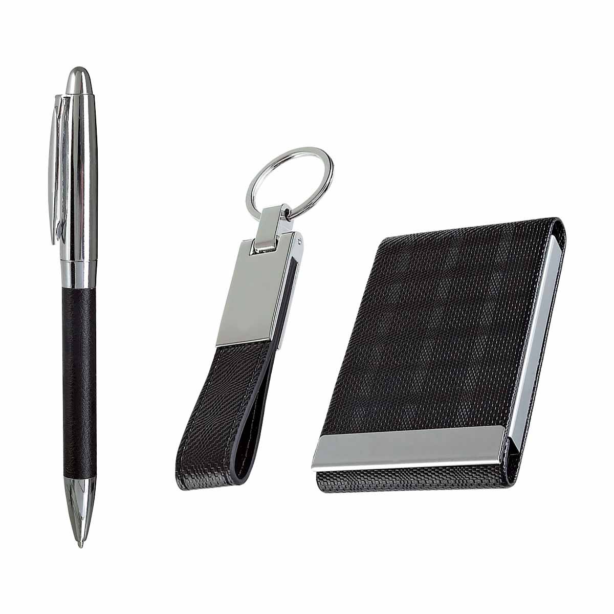 MATERIAL: Curpiel / Metal MEDIDAS: 2 x 12.7 cm Llavero / 1 x 13.4 cm Bolígrafo / 6.2 x 9.8 cm Tarjetero IMPRESION: Láser y Serigrafía en Bolígrafo y Tarjetero / Láser, Serigrafía y Termograbado en Llavero MED. EMPAQUE: 85.5 x 43 x 19.5 cm PESO EMPAQUE: 7.05 Kg PIEZAS EMPAQUE: 50