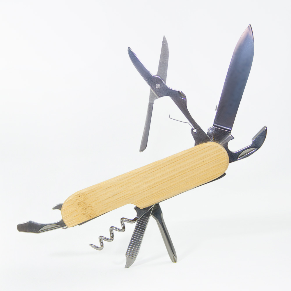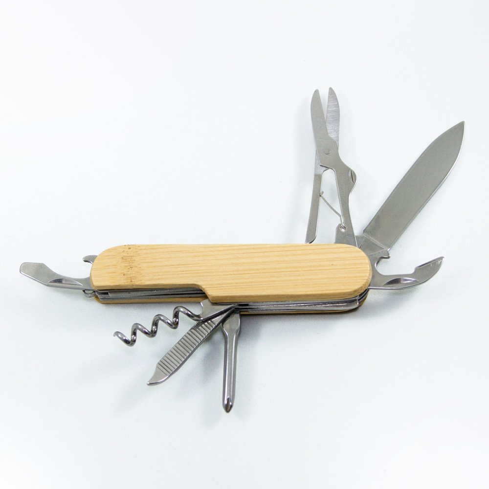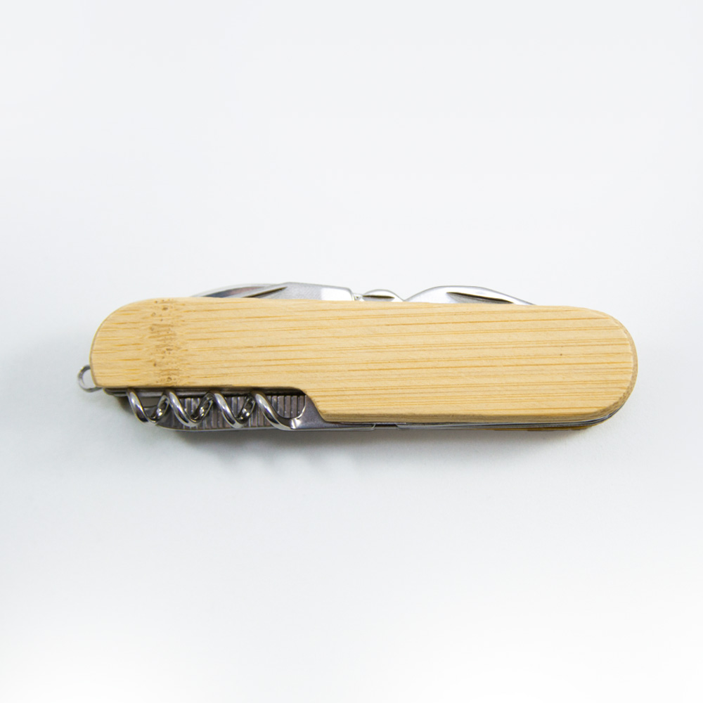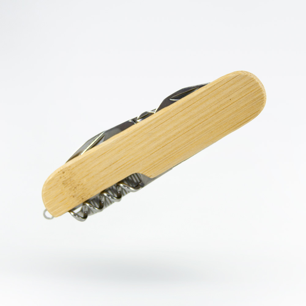 KAZAN. Navaja de bolsillo de acero inoxidable con 8 funciones y cubierta de bambú.