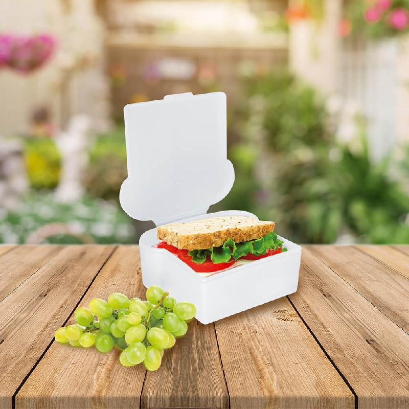 Contenedor para sándwich. Medidas: 14cm x 12.8cm x 5.3 cm Material: Plástico PP