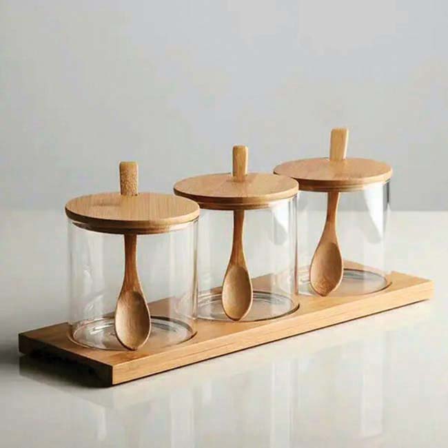 MATERIAL: Vidrio y Bamboo MEDIDAS: Frasco: 8.6. x 7.5 cm diametro. Base: 23 x 9 cm