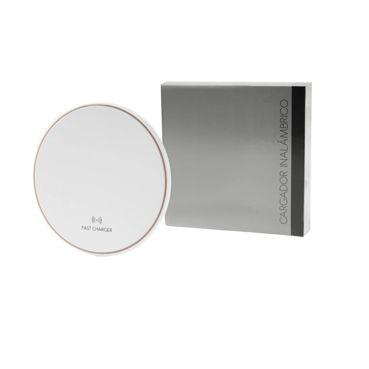 CARGADOR INALÁMBRICO CAMALI - Cargador inalámbrico "fast charge". Velocidad máxima de carga 15W. Se enciende luz color verde cuando está en reposo y luz color azul cuando está en proceso de carga. Incluye cable auxiliar tipo C y caja individual.