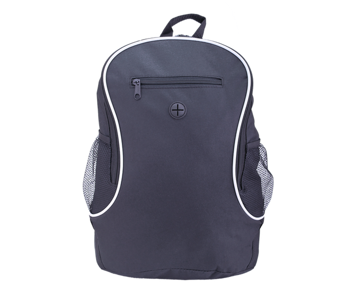 OLIMPIA - Mochila tipo backpack con salida para audífonos en el frente y bolsa de malla con cierre para guardar el celular o dispositivo. Con tirantes acolchados, correas ajustables, asa superior y bolsas de malla laterales.