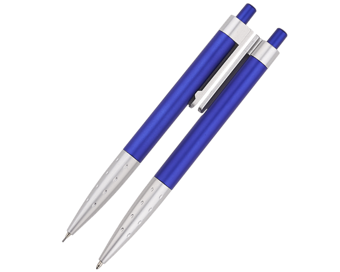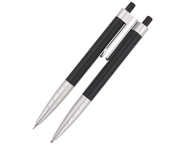 VERONA - Juego de bolígrafo y lapicero de plástico con clip que se ensambla uno al otro para quedar perfectamente unidos. El clip y la parte inferior vienen en color plata, esta última con diseño de pequeñas hendiduras. Incluyen estuche traslúcido de plástico. Mecanismo de click.