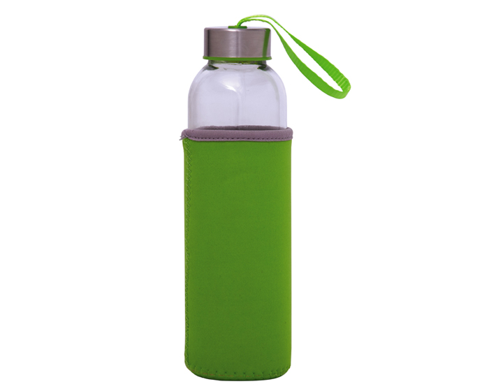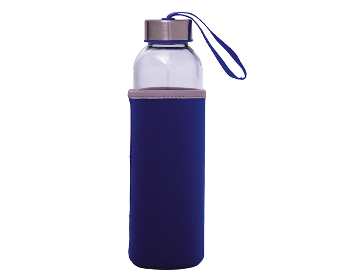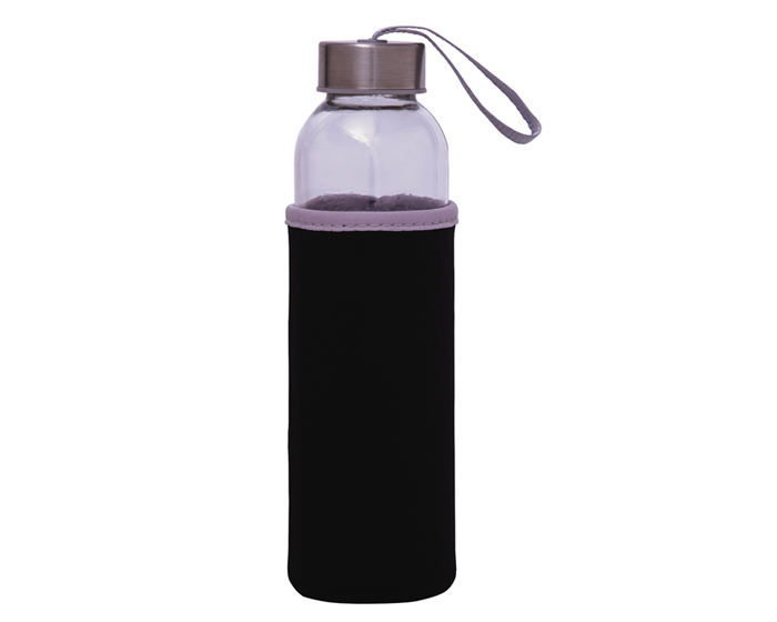 KRISTAL - Cilindro de vidrio con tapa de rosca y jareta de tela en color. Funda de Neopreno en colores. CAP. 500 ml. Presentación: caja en color blanco.