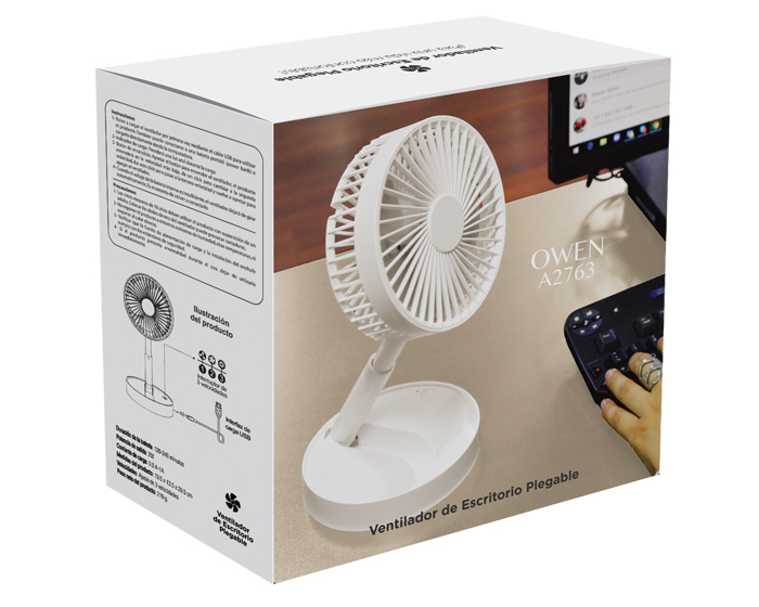 OWEN - Ventilador plegable ideal para interior o exterior. Cuenta con botón de encendido, presiona el botón y cambia la velocidad del aire en 3 diferentes intensidades. Cuerpo plegable que permite el movimiento del ventilador para ajustar la dirección del aire. Recarga mediante conexión USB, es plegable y ligero para que puedas llevarlo o guardarlo fácilmente. Incluye cable de carga. Presentación: caja de regalo a color.
