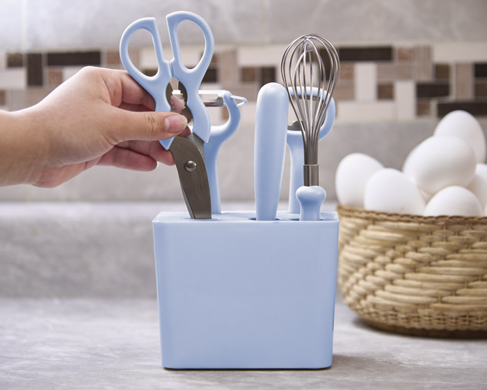 CUTTERS - Kit de accesorios de cocina que contiene: tijeras, batidor, pelador, destapador y cuchillo. Cuenta con una base de soporte. Presentación: caja en color blanco.
