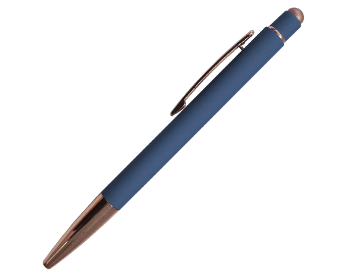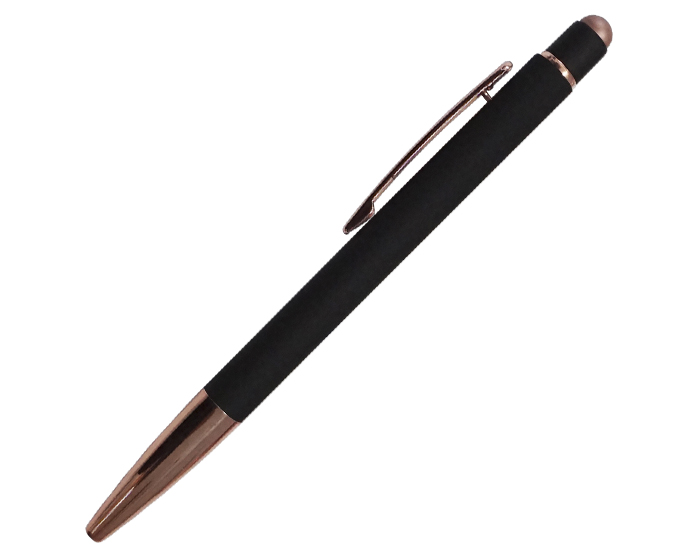 LEIA - Bolígrafo metálico de tinta negra alemana de 1.0 mm., con acabado de goma, suave al tacto; con punta y touch con terminado brillante en color oro rosa. Mecanismo de click.
