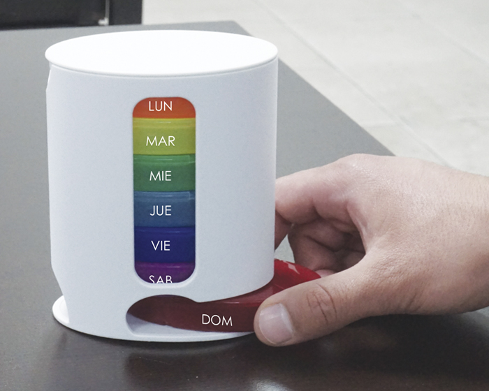 WEEK - Pastillero apilable semanal, cuenta con 7 bandejas extraíbles indicando el día de la semana, cada uno tiene 4 divisiones internas para un mejor control de los horarios del día. Esta torre se carga en la parte superior y se extrae por la parte inferior.
