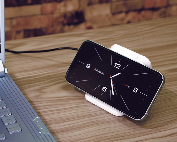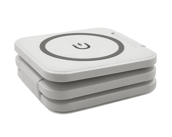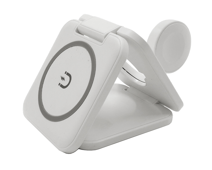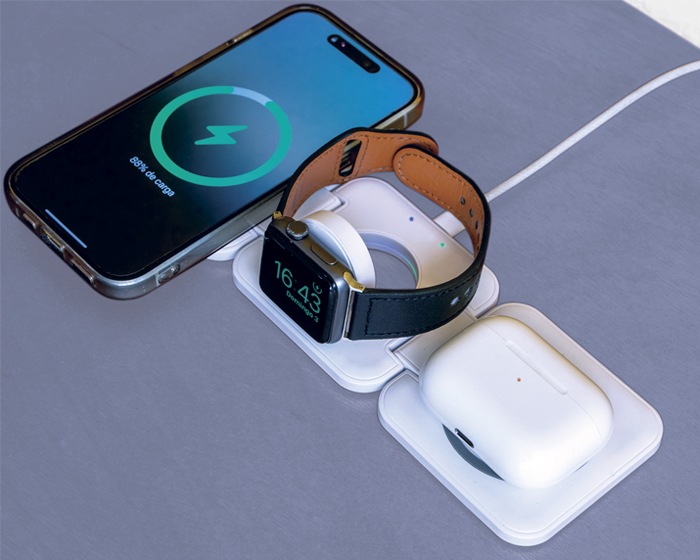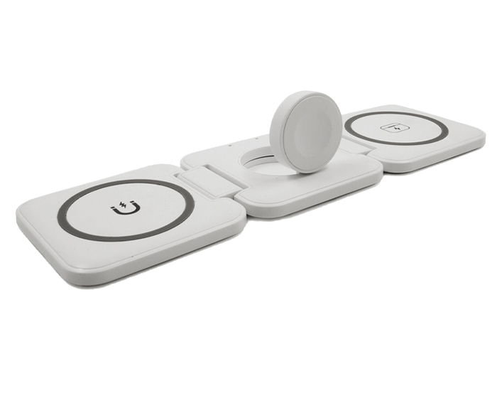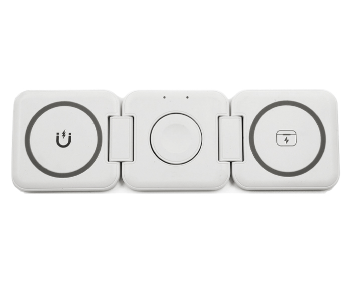 CRASH - Multicargador inalámbrico de carga rápida plegable con imán 3 en 1. Incluye: compartimento de carga para celular, para reloj inteligente (carga solo dispositivos Apple Watch) y para audífonos. Cuenta con 2 indicadores LED de carga. Entrada de carga tipo C (incluye cable de carga). Compatible con dispositivos iOS. Presentación: caja de regalo a color. (Verifique la compatibilidad con sus dispositivos móviles).