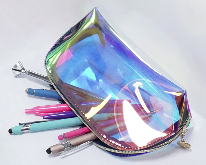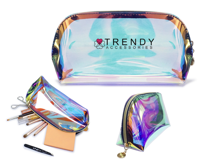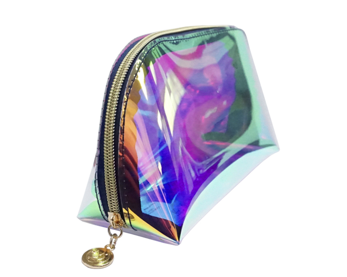 GLAM - Cosmetiquera de efecto tornasol. Material repelente al agua. Cuenta con cierre metálico.