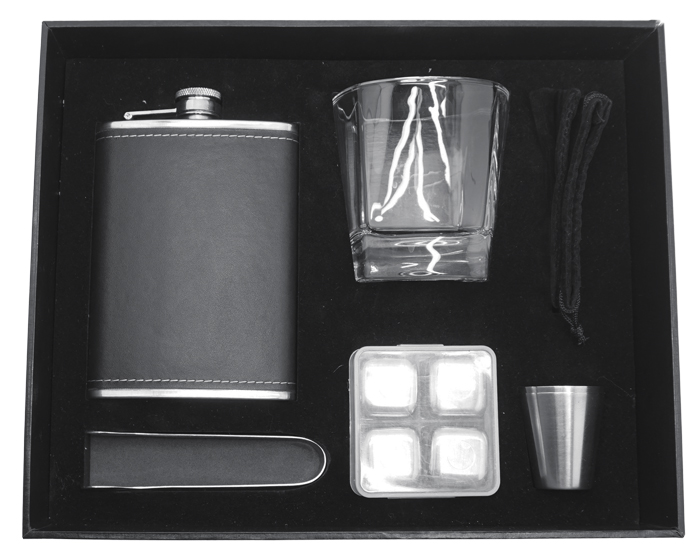 GATSBY - Set de licorera que incluye: Licorera de bolsillo de acero inoxidable con tapa de rosca y detalle en curpiel con CAP. 8 OZ, un vaso de vidrio para whisky, pinzas de acero inoxidable para hielos, estuche con 4 hielos metálicos y 2 vasos de acero inoxidable para shots. Incluye caja de regalo.