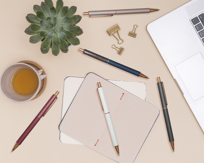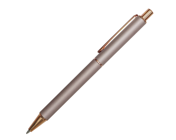 VERDI - Bolígrafo delgado de aluminio, con botón, clip, detalle central y punta, cromados en color Oro rosa. Barril superior con acabado metálico mate y barril inferior en el mismo color, con acabado de goma. Mecanismo de click.