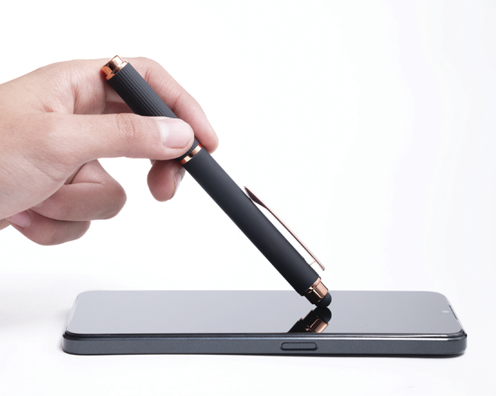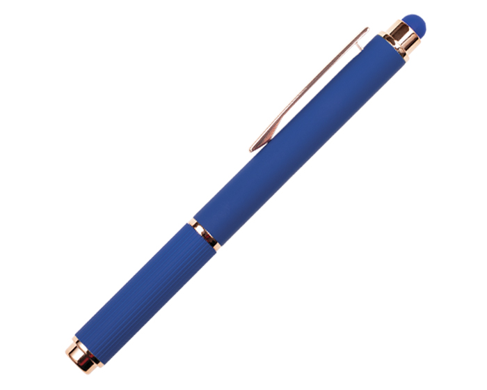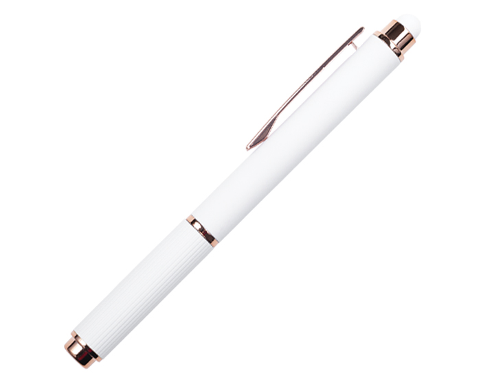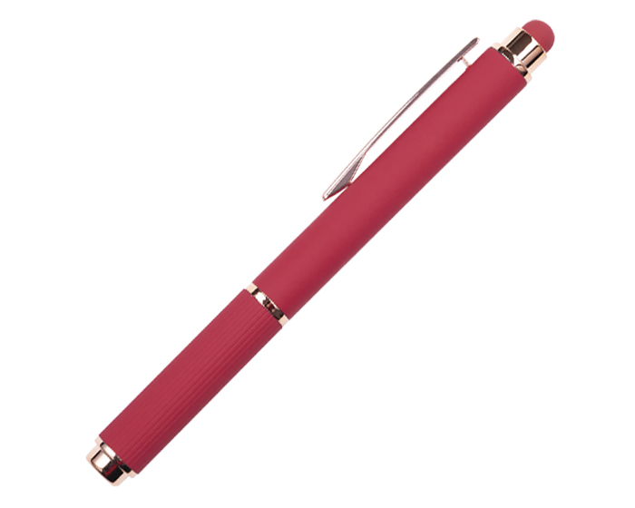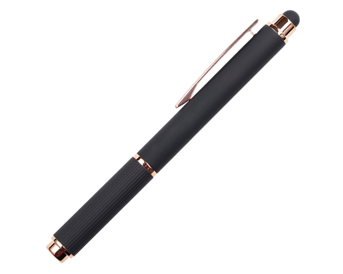 LOHAN - Bolígrafo de aluminio tipo roller, con acabado de goma suave al tacto y detalles en oro rosa. Cuenta con touch screen en la parte superior del color del bolígrafo y su tapa cuenta con sutiles líneas verticales. Al grabar en laser CO2, destapa en color oro rosa.