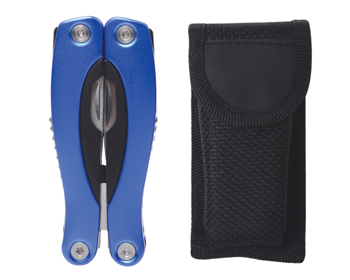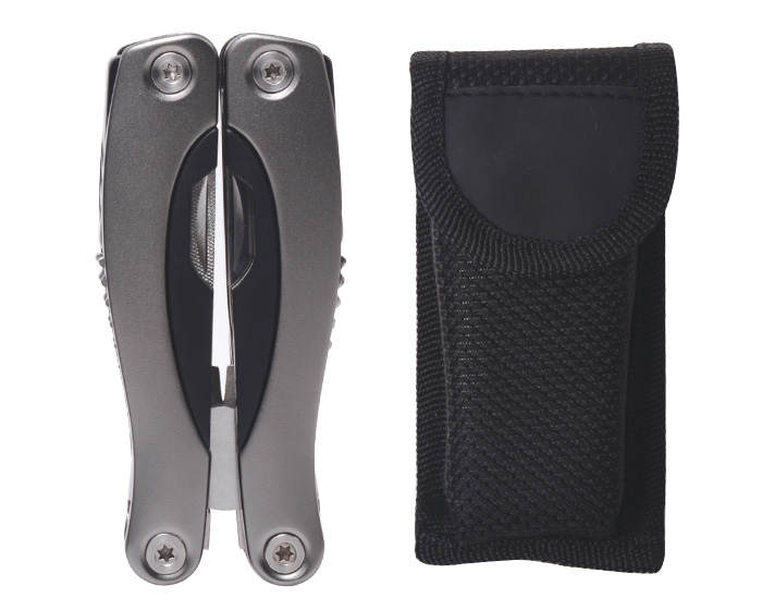 MAGNO - Herramienta plegable con 9 funciones: pinzas de punta, navaja, dos desarmadores planos y un desarmador de cruz, sierra, destapador doble, abrelatas y lima. Con superficie antideslizante para mejor manipulación. Cuenta con seguro de bloqueo para fijar cada herramienta. Incluye estuche. Presentación: caja en color negro.