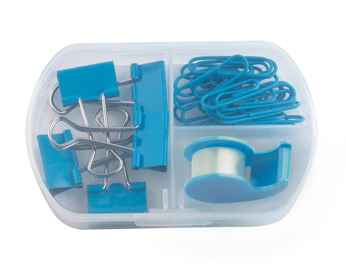 TRIM - Set de papelería que incluye mini despachador de cinta adhesiva, 5 clips sujeta documentos y 20 clips para papel. Presentación: estuche de plástico transparente.