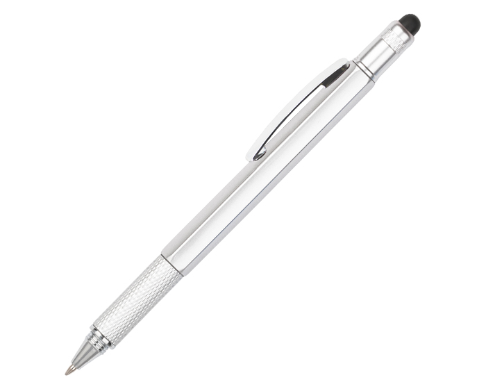 HEXA - Bolígrafo de plástico 6 en 1, diseño de cuerpo hexagonal que cuenta con regla de 7 cm y 3 pulgadas, nivelador y clip de metal. Puntero para pantallas táctiles. Incluye punta destornillador plano y de cruz, que se guarda y fija en el cuerpo de la pluma. Mecanismo retráctil.