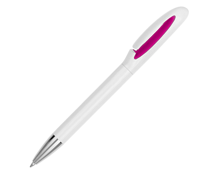 NADIA - Bolígrafo plástico de cuerpo blanco con punta cromada. Novedoso diseño de clip con detalle en color. Ligero y cómodo. Mecanismo retráctil.