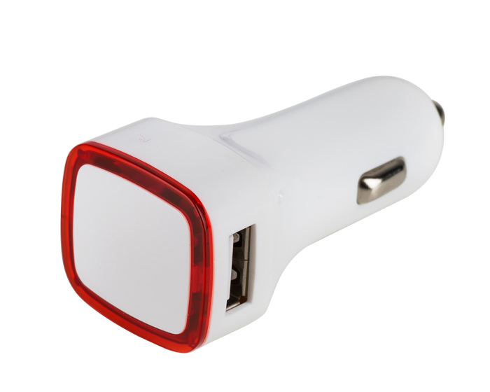MOBICAR - Cargador para automóvil con 2 entradas USB. Fino detalle de color traslúcido en contorno. Voltaje 5.1V, 1A y 2.1A. Presentación: caja en color blanco.