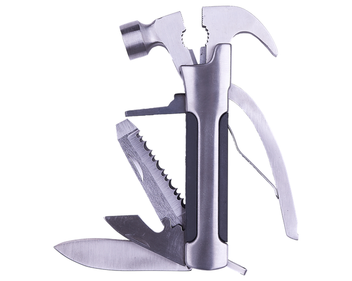 THOR - Herramienta plegable tipo martillo con 11 funciones. Incluye: martillo, pinzas, cortador de alambre, sacaclavos, 2 desarmadores planos, desarmador de cruz, destapador, lima, cuchillo y sierra. Cuenta con seguro de bloqueo para fijar las herramientas. Incluye estuche. Presentación: caja en color blanco.