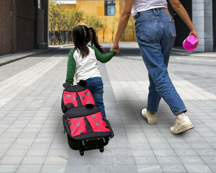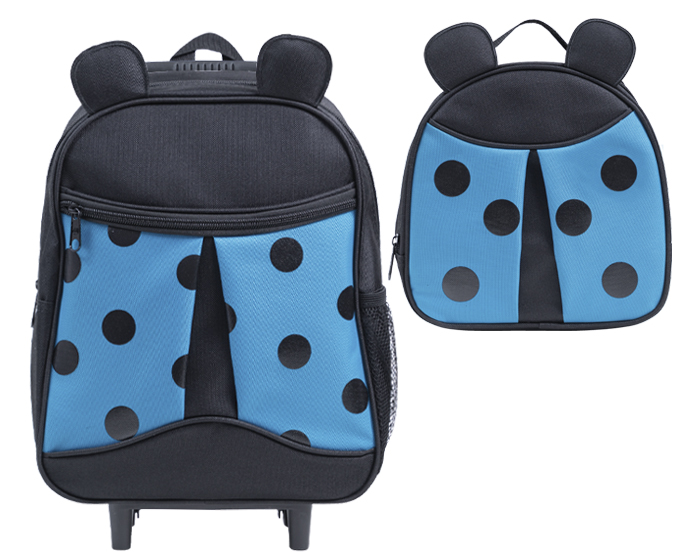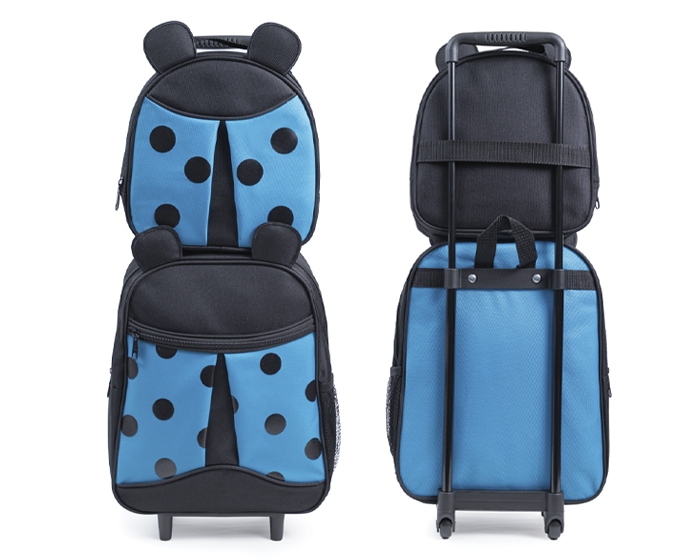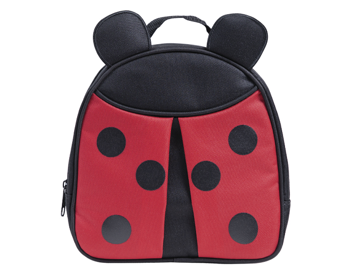 MATILDA - Mochila infantil con diseño de catarina y carrito para transportar que cuenta con: compartimento interno con cierre, compartimento externo con cierre, bolsa de malla lateral con resorte y asa para transportar, además Incluye una lonchera con compartimento interno cosido de plástico anti escurrimiento con cierre y con el mismo diseño de catarina, cintillo en la parte trasera para adaptarse al carrito y asa para transportar. además la lonchera puedes guardarla dentro de la mochila.