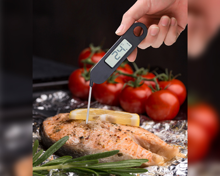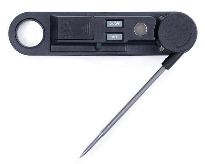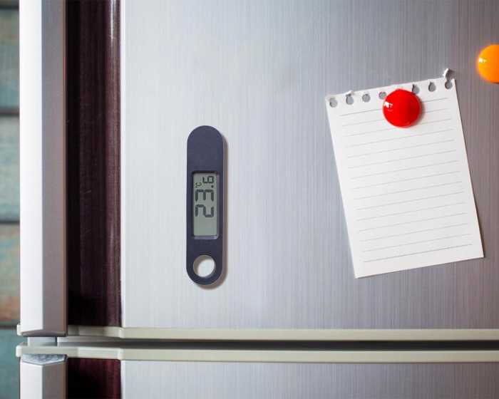 MEAL - Termómetro de cocina con pantalla digital, cuenta con aguja plegable de acero inoxidable para medir la temperatura de carnes, agua o alimentos; tiene arillo para colgarse o sostenerse e imán en la parte trasera. El termómetro se apaga automáticamente en un lapso de 10 min. Botón de unidad de Medición: grados centígrados y grados Fahrenheit, Rango de resistencia: de -20 a 250 grados centígrados. Incluye una batería de botón. Presentación: caja de color.