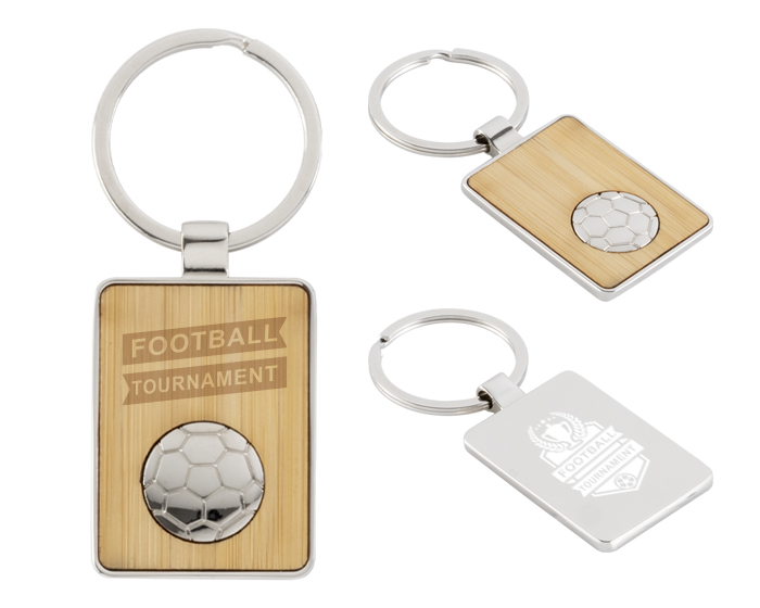 MEZZI - Llavero de bambú con balón metálico de futbol de soccer. Presentación: Caja individual.
