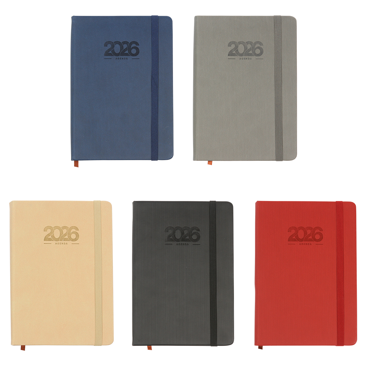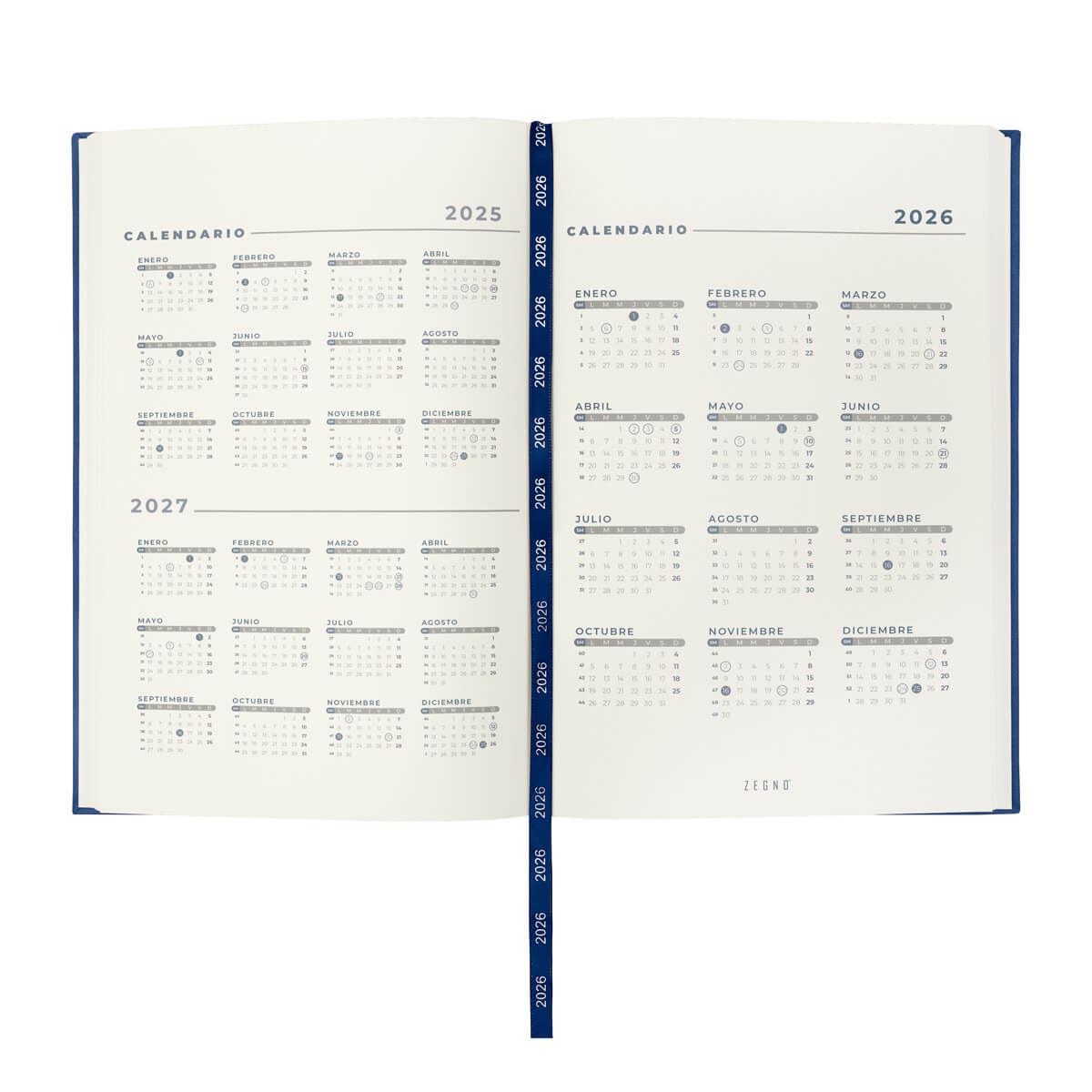 AGENDA DIARIA TERRA 2026 - Agenda diaria con 186 hojas. Contiene datos personales, calendarios 2025-2026-2027, planeador 2026, seguimiento de nuevos hábitos, organizador de tareas, planeador de proyectos y días festivos. Incluye caja individual del mismo color a la agenda.