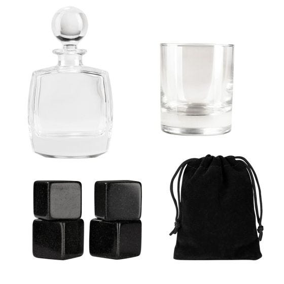 SET DE BAR ISLAY - Set de bar. Incluye licorera, vaso de cristal, 4 enfriadores de piedra, bolsa de terciopelo con cierre de jareta y estuche de madera.