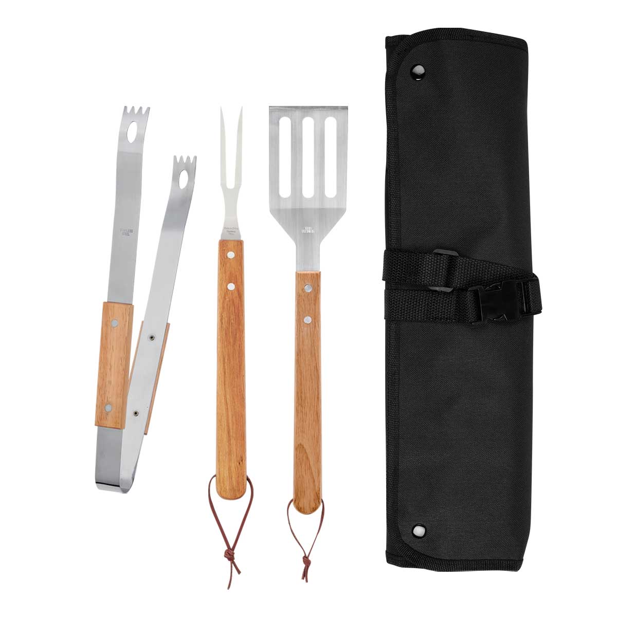 MATERIAL: Acero Inoxidable y Madera Caucho Utensilios / Poliéster Mandil MEDIDAS: 43.5 x 60 cm IMPRESION: Bordado / Serigrafía MED. EMPAQUE: 48.5 x 32 x 27 cm PESO EMPAQUE: 2.36 Kg PIEZAS EMPAQUE: 20
