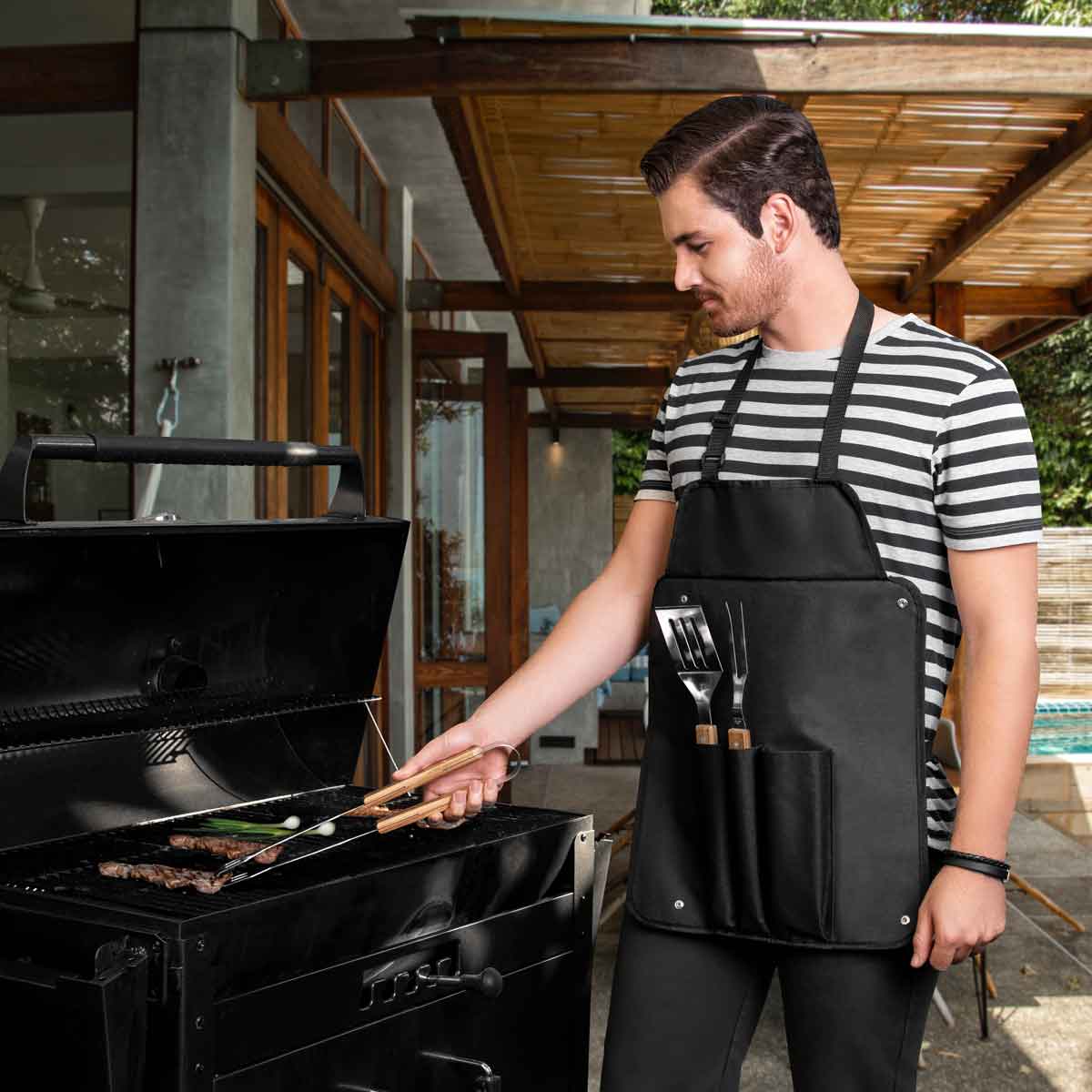 SET DE BBQ TAROUDANT - Set de BBQ en delantal. Incluye espátula, pinzas, tenedor y correas ajustables en cuello y cintura.