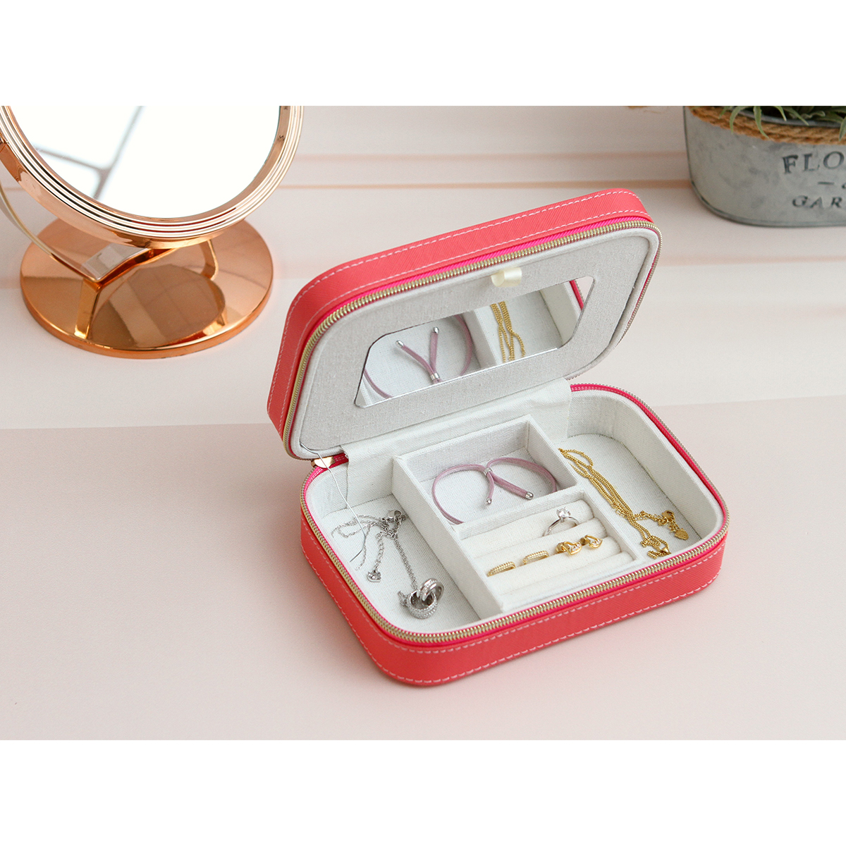 Contenedor Pazzano. - Contenedor para almacenar joyería fabricado en cartón, curpiel y tela es una opción elegante y práctica para mantener tus joyas organizadas y protegidas. Con sus diversos compartimentos internos, cuenta con un espejo. Incluye caja de cartón individual.