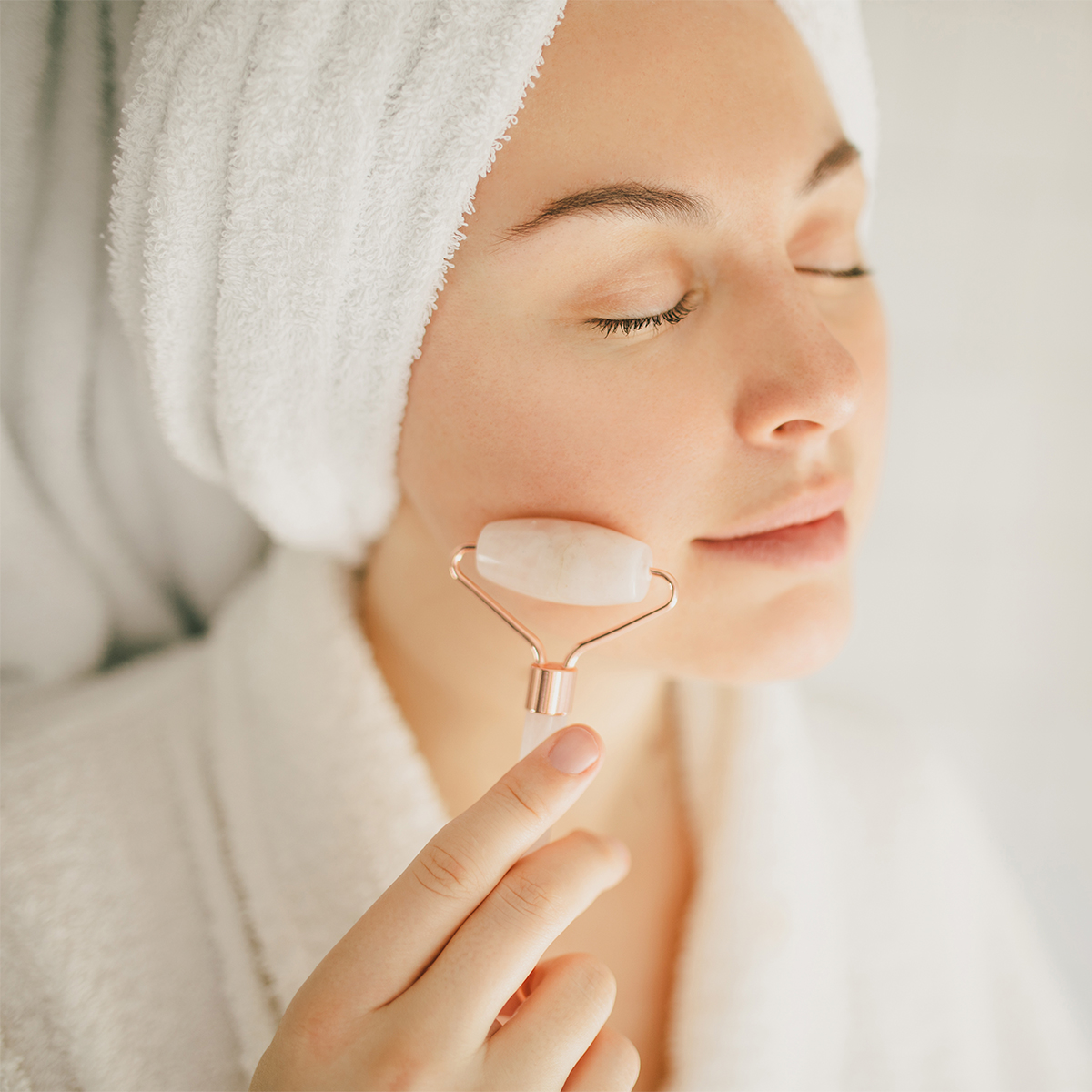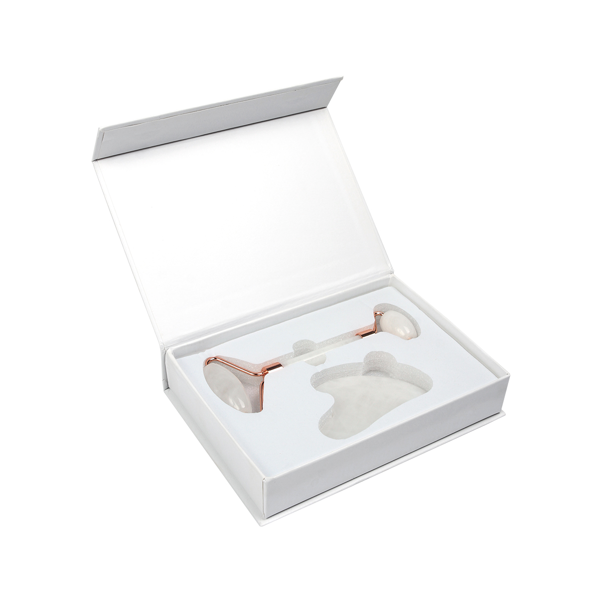 Juego de masajeadores Chioggia. - Juego de masajeadores para el rostro que incluye un rodillo fabricado en cuarzo blanco y acero con terminado rose gold, 1 gua-sha de cuarzo blanco, y una caja para regalo con suaje. La piedra de cuarzo blanco tiene propiedades calmantes y refrescantes para la piel, este producto ayuda a mejorar la circulación, reducir la hinchazón y promover un cutis más radiante. Este juego  te ofrece una oportunidad única de mimarte y cuidar de tu piel de una manera lujosa y relajante. Es perfecto para aquellos que buscan una rutina de cuidado facial efectiva, holística y elegante.