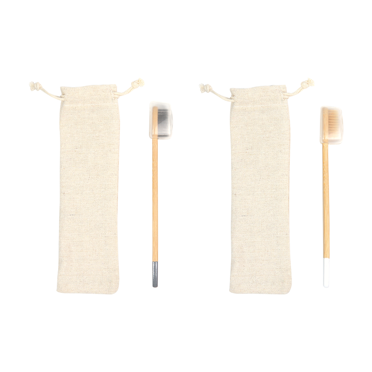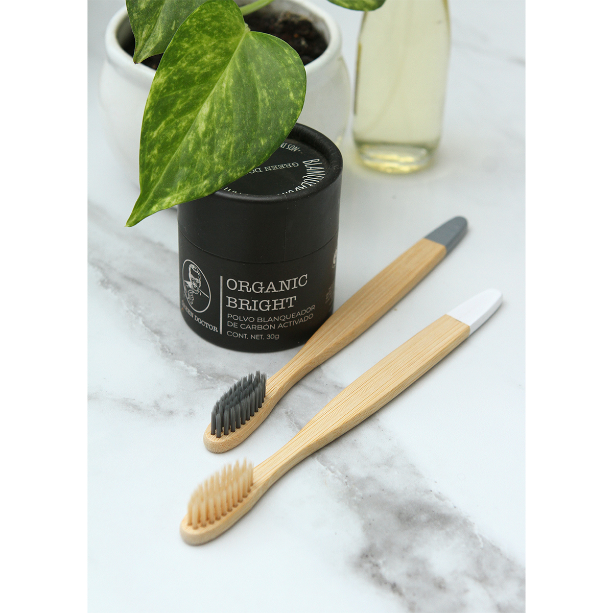 Cepillo Orán. - Cepillo dental fabricado en madera de bambú con acabado en laca que le da un acabado brillante y es útil para una mayor resistencia a sustancias abrasivas y durabilidad. Incluye un protector  de plástico para las cerdas y una bolsita de algodón de medidas 22x3 centímetros. Disponible con detalles en la punta inferior del cepillo en dos colores, gris y blanco.