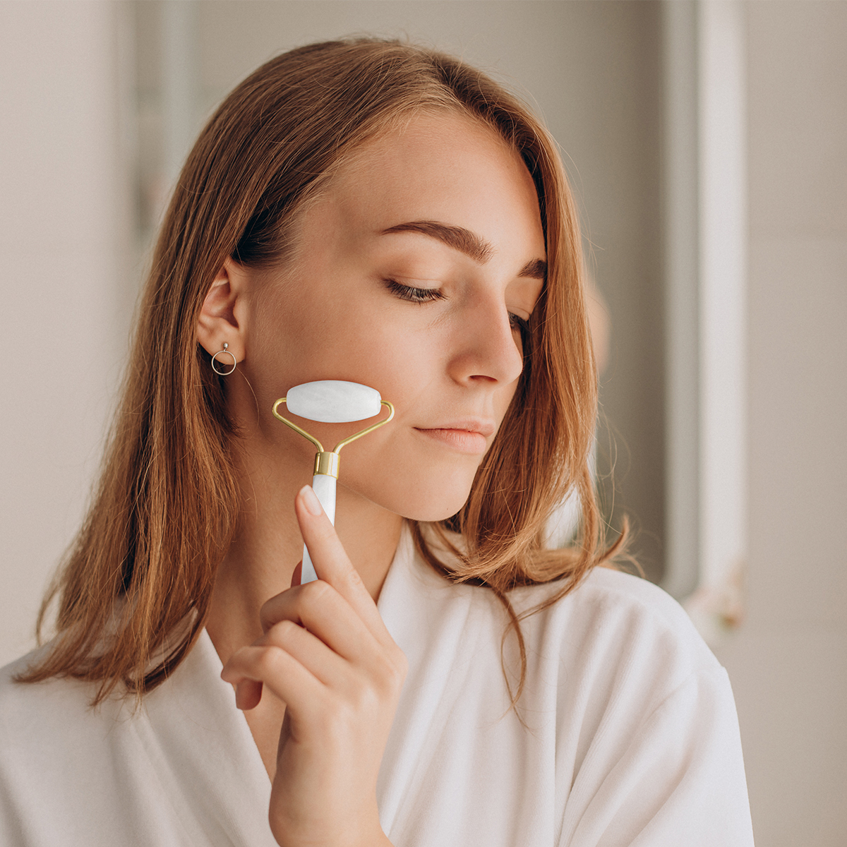 Set masajeador Bakel - Rodillo de cuarzo blanco para masaje facial con bolsa de tela. El rodillo de cuarzo para masaje facial es una herramienta versátil y elegante que puede contribuir a mejorar la salud y la apariencia de la piel del rostro. Su estuche de tela es ideal para mantener el rodillo limpio y protegido cuando no está en uso.