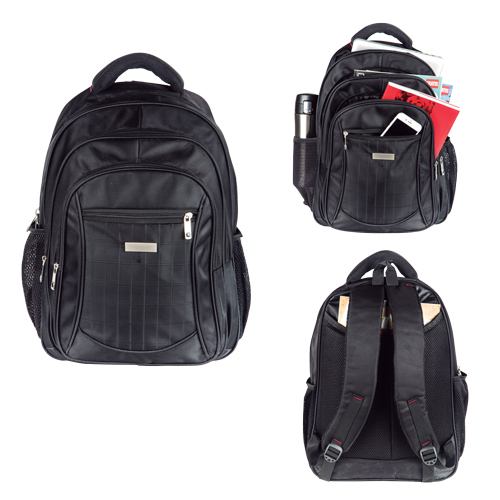 ELITE Mochila de poliéster con espacio para laptop max. de 17 pulgadas. 4 bolsas frontales, asa y 2 bolsas laterales de malla, respaldo, tirantes acojinados y placa metálica.