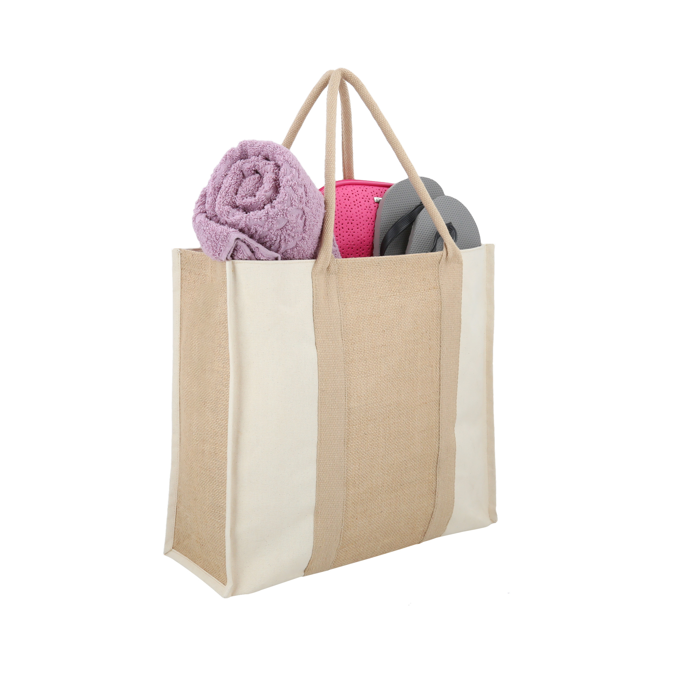 MALDIVAS Bolsa de yute con loneta, interior laminado con asas, fuelle y cierre.