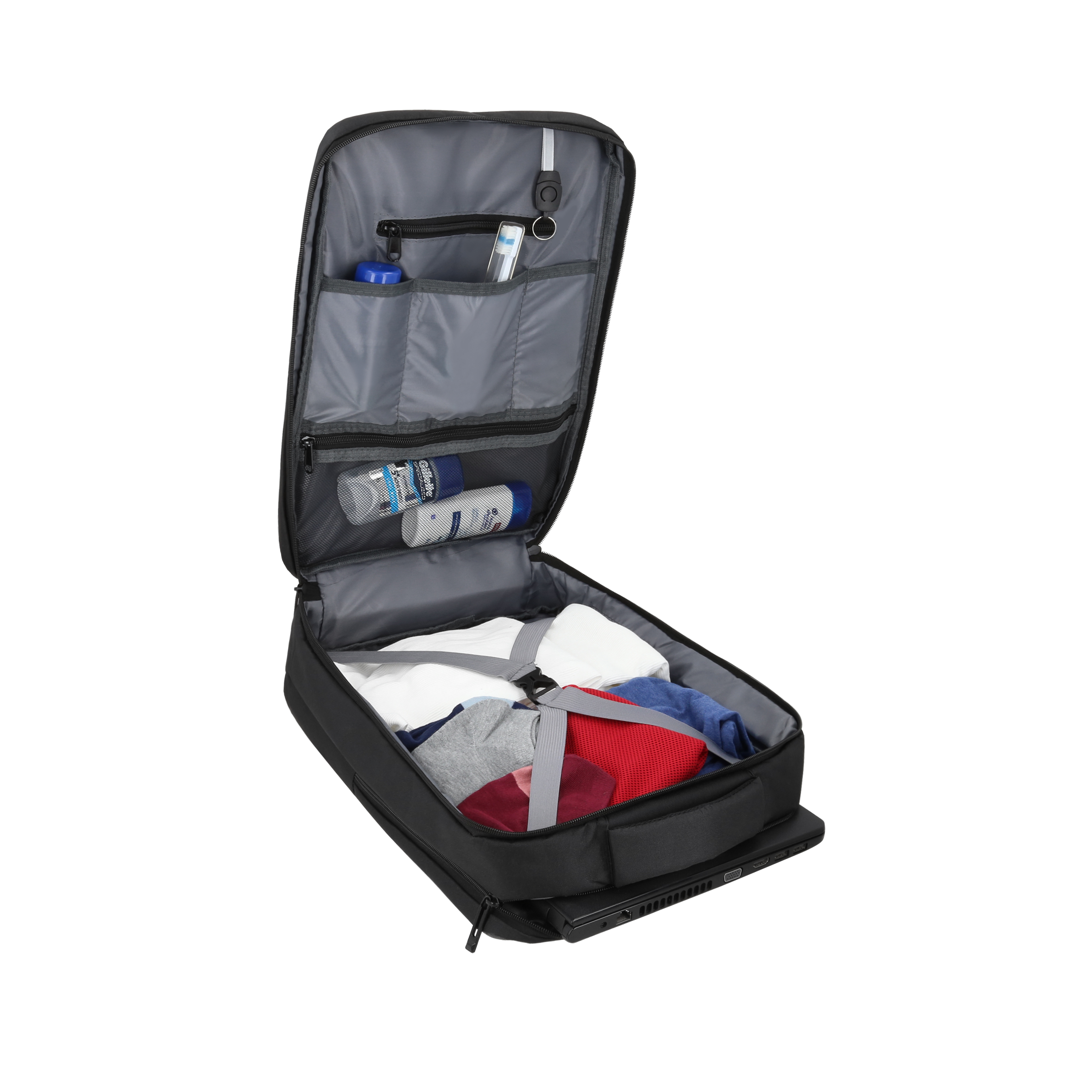 SUWON Mochila con abertura 360, 1 compartimento principal con resortes, bolsa frontal, organizador interno y porta llaves. Incluye bolsa de seguridad con porta laptop de 16" y asa.