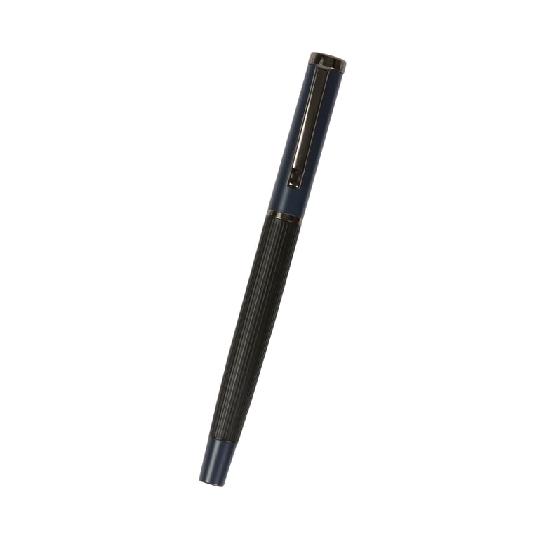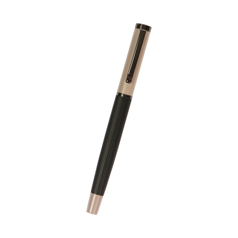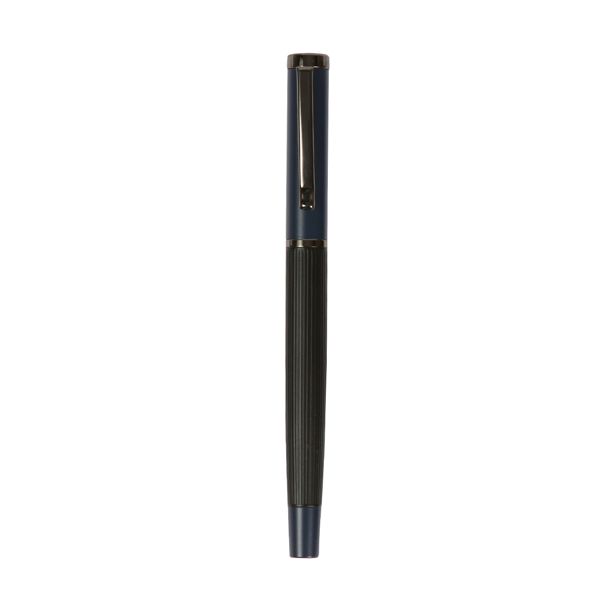 Bolígrafo Enfield. - Bolígrafo con barril fabricado en acero inoxidable, con detalles en color plateado, tipo roller. Tinta de escritura de gel color negro. Incluye caja de regalo color negro.