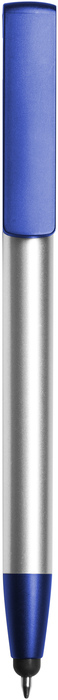 BOLÍGRAFO PLÁSTICO “CAPRI” Cuerpo plástico plateado y detalles de color. El clip tiene un ranura que funciona para soporte de celular. Puntera touch.