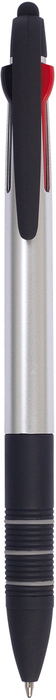 BOLÍGRAFO TOUCH TRES TINTAS "DREI" Cuerpo plateado. En la parte superior touch negro, clip y puntera del mismo color. Tinta azul-roja-negra.
