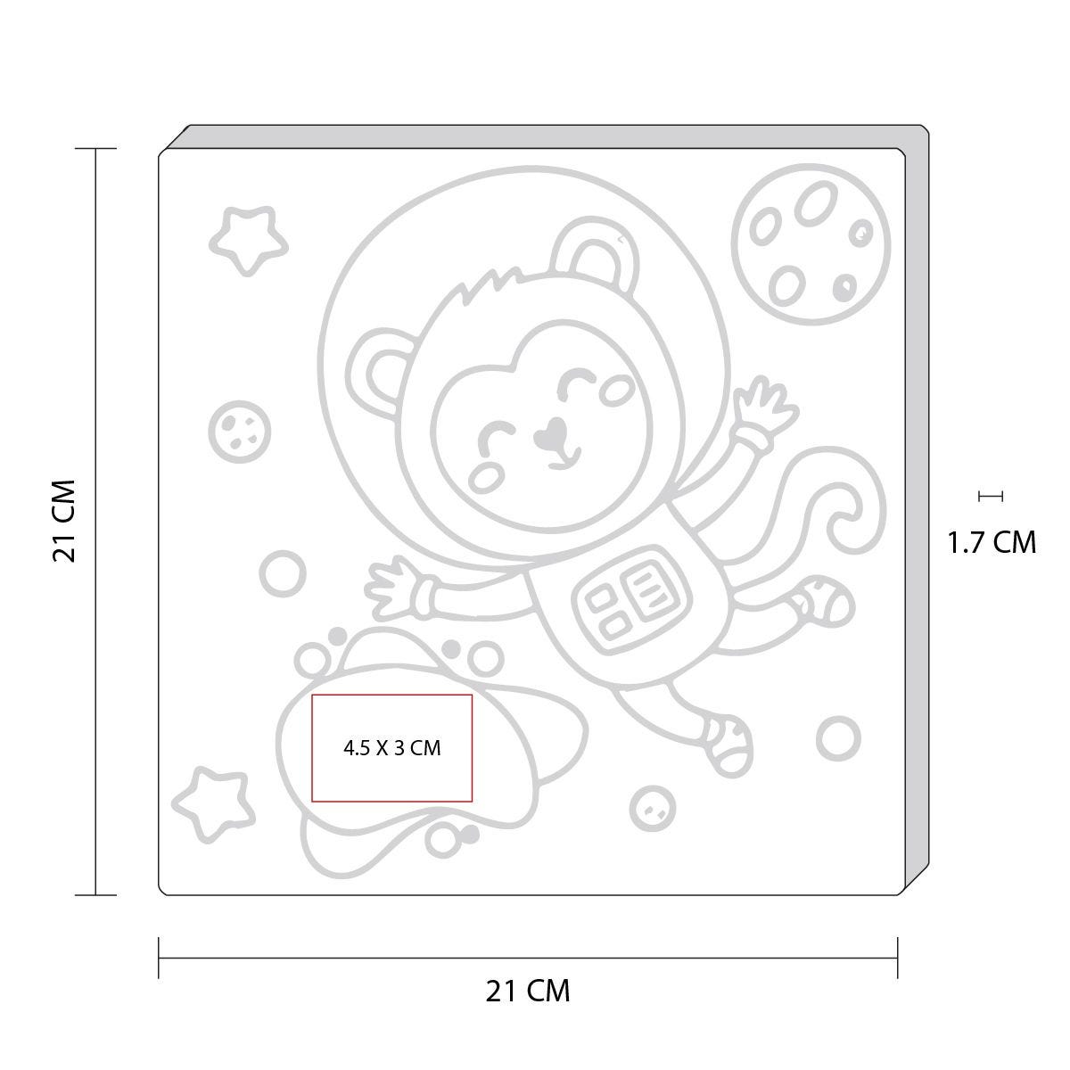 MATERIAL: Madera / Canvas / Plástico MEDIDAS: 21 x 21 cm IMPRESION: Serigrafía / Tampografía MED. EMPAQUE: 44.5 x 23 x 42 cm PESO EMPAQUE: 4.22 Kg PIEZAS EMPAQUE: 40