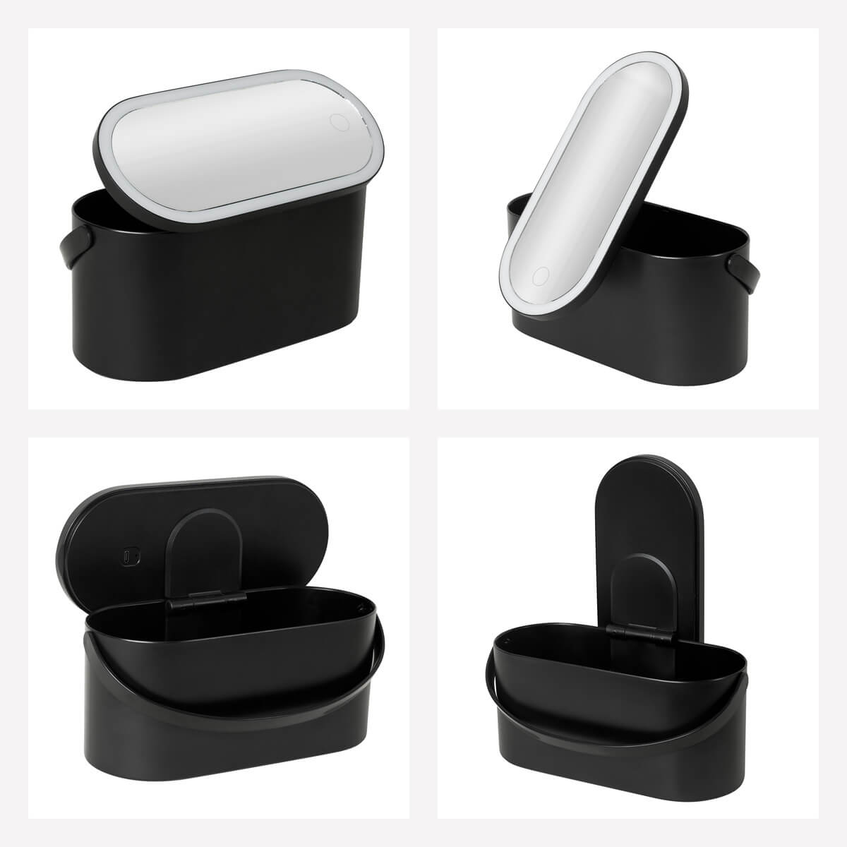 NECESER DARISSA - Organizador de cosméticos con espejo integrado. Su tapa incluye un espejo con luz LED ajustable a 3 intensidades, se activa presionando por 5 segundos el botón touch. El diseño versátil permite ajustar el espejo en diferentes posiciones, incluso desmontarlo y utilizarlo de manera individual, brindando comodidad y precisión al maquillarte. Compacto y elegante, es el accesorio ideal para mantener tus accesorios organizados. Batería recargable e incluye cable con conexión USB-C y caja individual.