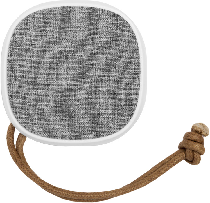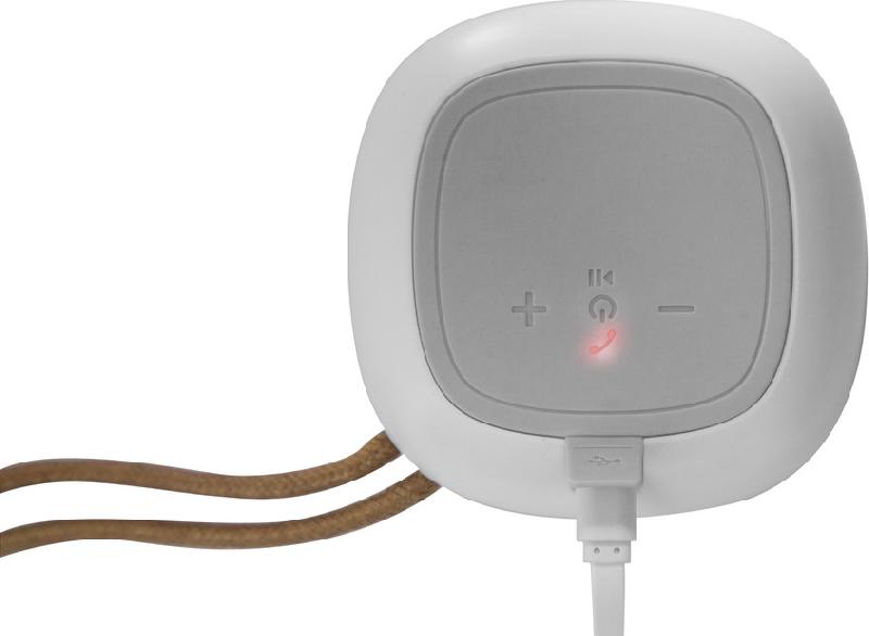 BOCINA BLUETOOTH "LÉUCADE" Bocina bluetooth cubierto en tela. En la parte inferior engomado antideslizante con botones para encender o apagar, play/pausa y responder llamadas. Botón de retroceso y avance, este último, si se mantiene presionado durante unos segundos pasa al siguiente sonido, estos mismos botones permiten aumentar o disminuir el volumen. Entrada USB incluye cable. Lazo de tela color marrón que permite colgarlo. Duración de la batería 8 - 12 hs aprox.