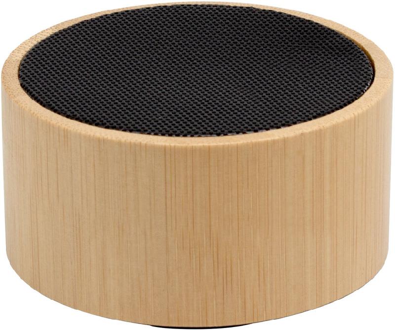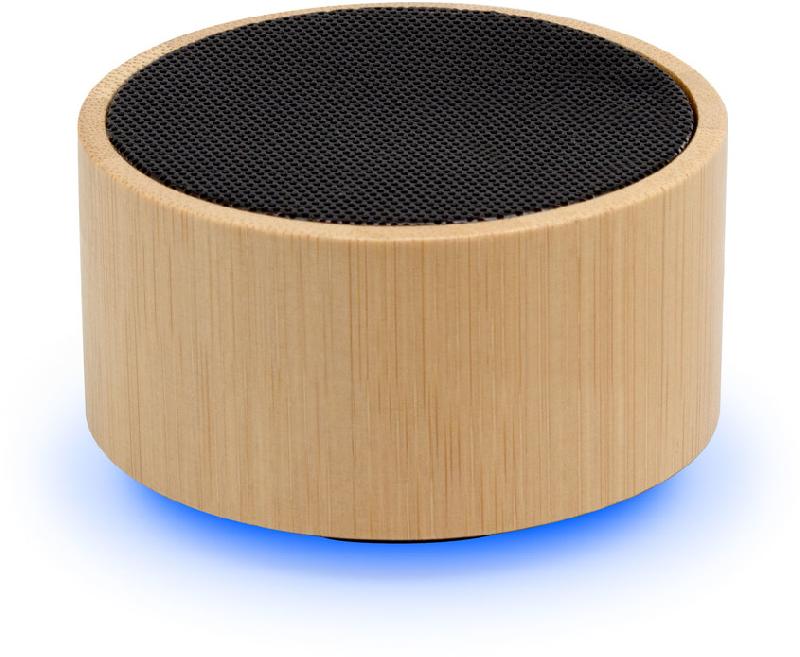 BOCINA BLUETOOTH "CANNES" Bocina Bluetooth. Caja redonda de Bambú color natural con malla metálica en la parte superior. Base negra con panel de control. Permite recibir llamadas. Micrófono incorporado. Versión bluetooth: 5.0. Batería: 300 mAh. Potencia: 3W. Cable de carga y conexión USB tipo C en color negro. Presentación en caja de regalo Kraft.